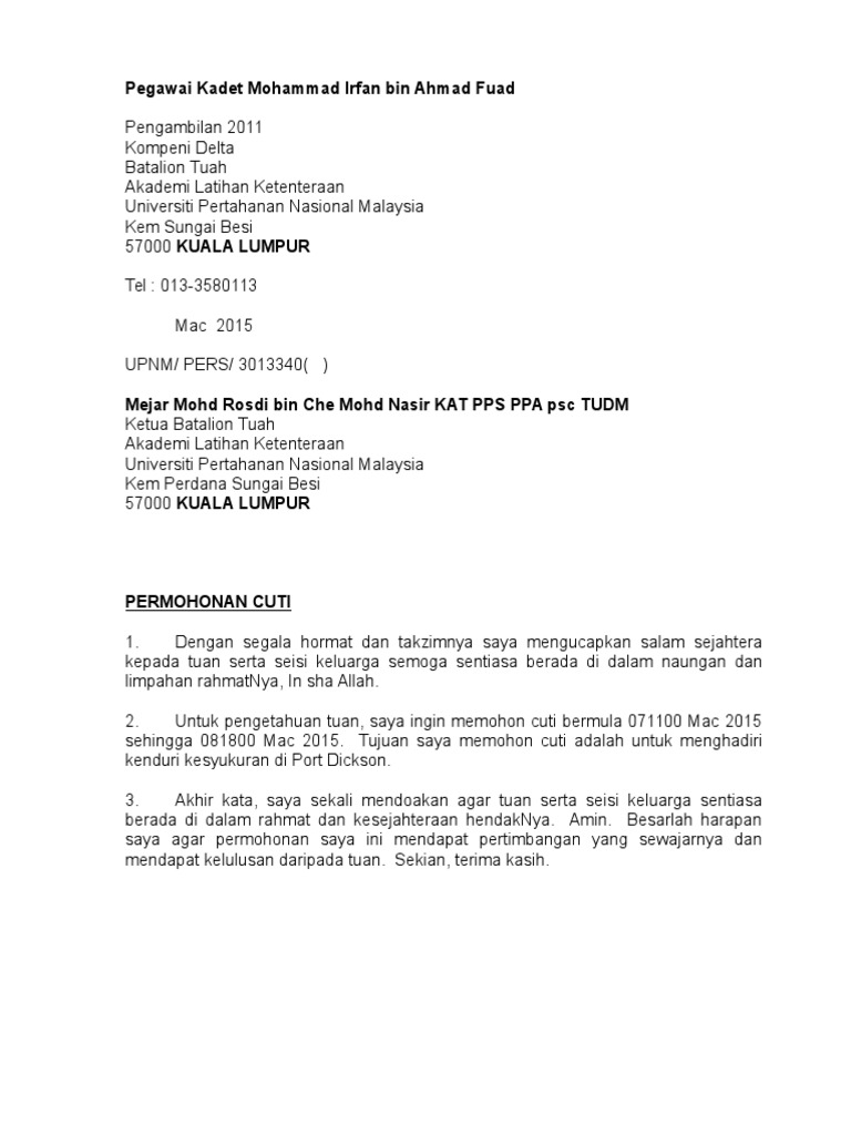 Contoh Surat Cuti Tentera